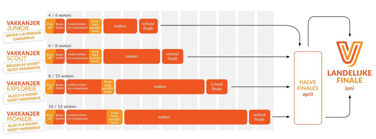 Dat doen ze in teams, als bedrijf in het klein: de docent heeft een coachende rol. De schoolwinnaars gaan door naar de halve finales en mogelijk de landelijke finale. Vakkanjer Explorer sluit aan op het curriculum en scholen kunnen er verschillende eindtermen mee afdekken (zowel technisch als niet-technisch). Deelnemende docenten krijgen uitgebreide ondersteuning. S